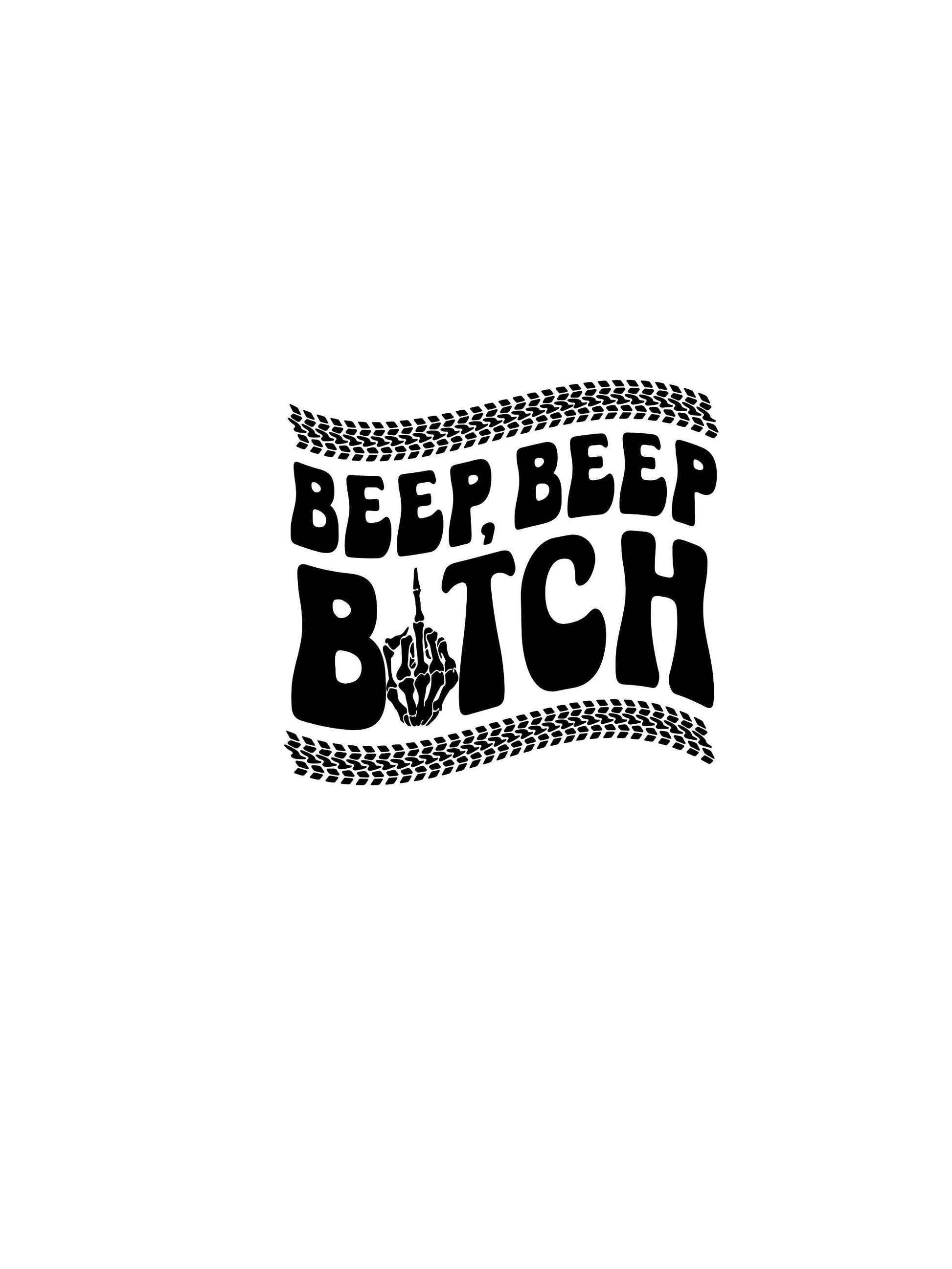 Add some humor and attitude to your ride with this "Beep Beep Bitch" skeleton hand flipping off viewer decal. Perfect for expressing your personality and adding a bold statement to your car's back window. Made from high-quality, weather-resistant vinyl, this decal is durable, easy to apply, and sure to turn heads wherever you go. Great for drivers who want to showcase their edgy sense of humor and stand out on the road.